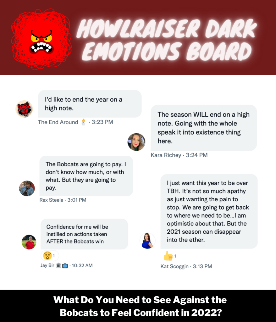 The season finale with Texas State will give many within the program (player and personnel alike) one last shot at buying into what Jones is cooking, or exploring more agreeable realms. At this point in the season, the 2-9 Red Wolves are evaluating talent and identifying contributors for 2022. A victory over the Bobcats will be the result of delivering extra effort and attention, after which I suspect we’ll see some Kong-sized shifts within the program.