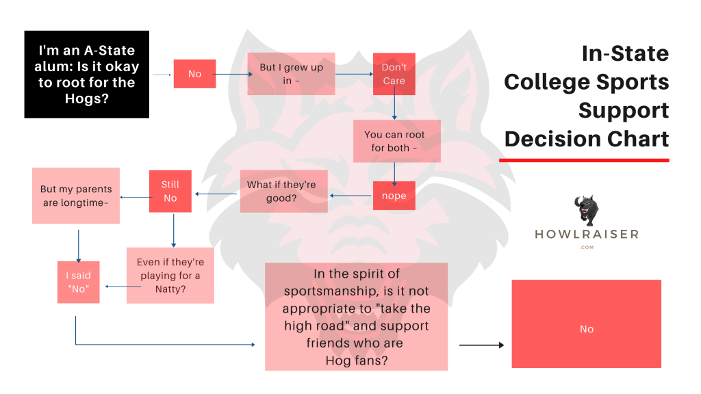 Rather than patiently explain when it’s appropriate for an Arkansas State alum to cheer for the Razorbacks, I put together this “decision” chart in an effort to make myself more clear.