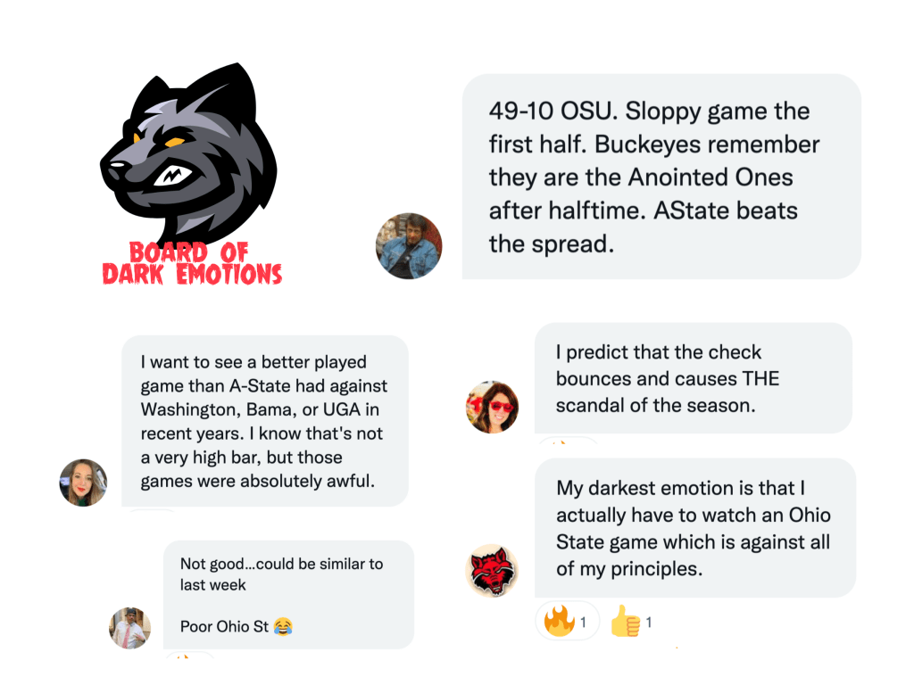 Can the Red Wolves overcome that 43.5 point spread? Can Arkansas State possibly win the game outright? Ours is a broad and beautiful universe of glorious possibility. With that, I punt it to the Fates.
