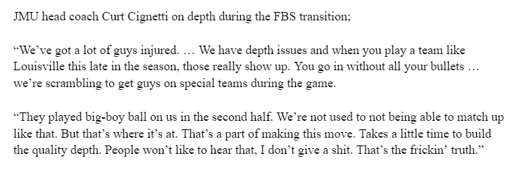 Since defeating Arkansas State and entering the AP Top 25, James Madison has dropped three straight, including Saturday night’s disappointing game with Louisville. Dukes head coach Curt Cignetti, who gives zero fucks, delivered some perspective after the game (courtesy of Noah Fleischman):