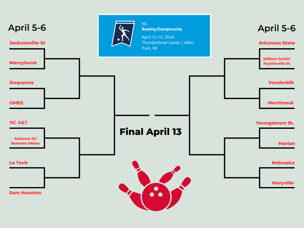 The 2024 National Collegiate Bowling Championship is a double-elimination tournament using the mega-match format (traditional team game, 5-game Baker set and, if the teams split those, a best-of-seven Baker series. Sessions begin on April 4 at 8 a.m. (CT) and 2 p.m. (CT) daily at Bowl-A-Roll Lanes in Rochester, N.Y. You can watch live on BOWL.TV. The championship game will be televised live in Detroit on ESPNU.