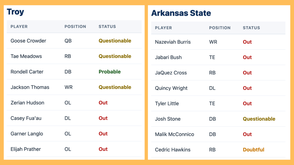 For Arkansas State, Cedric Hawkins is a surprise DOUBTFUL, and there appears to be no movement for tight ends Jabari Bush and Tyler Little, leaving Tyler Fortenberry to receive the majority of snaps.